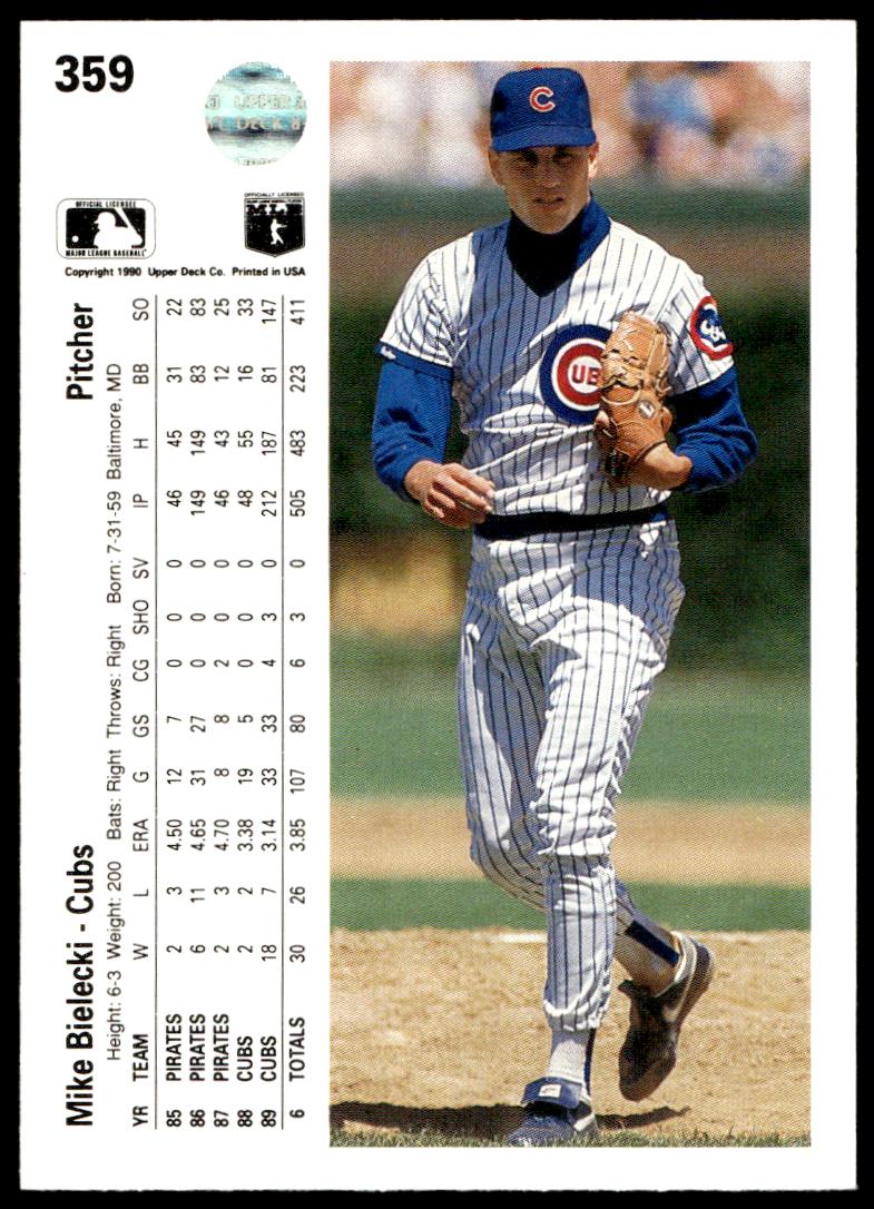 This BaseballΒ card, from 1990 is part of the Upper Deck Β card set. Mike Bielecki is featured and has a card number of 359.