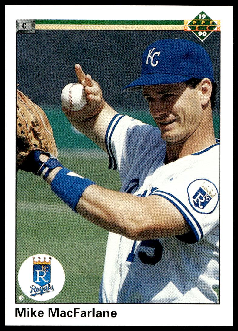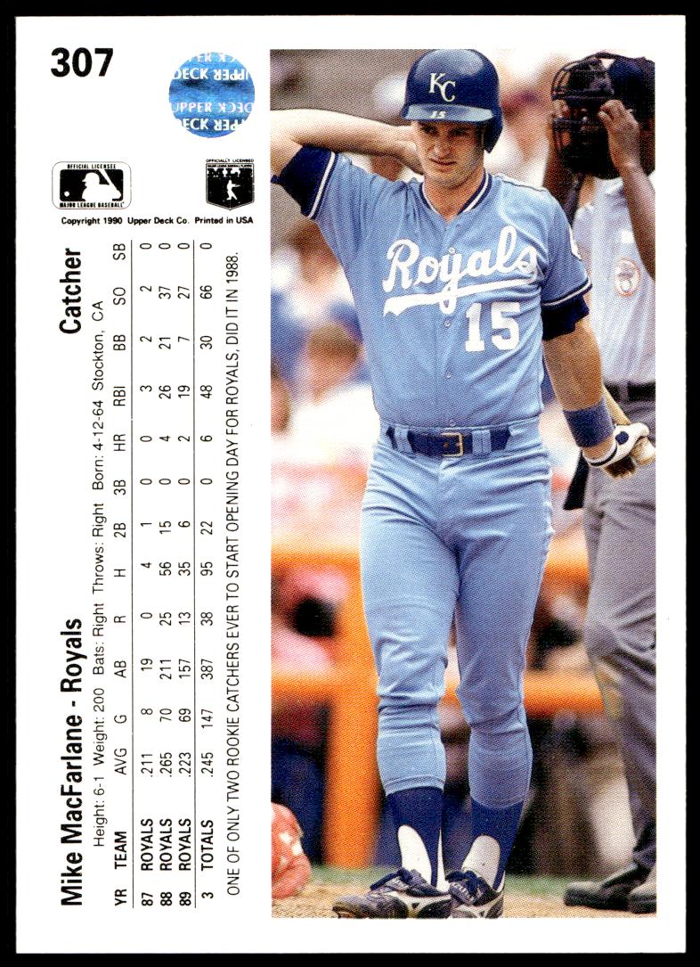 This BaseballΒ card, from 1990 is part of the Upper Deck Β card set. Mike Macfarlane is featured and has a card number of 307.