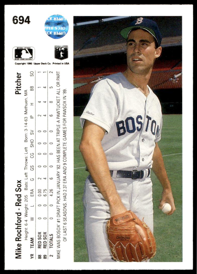This BaseballΒ card, from 1990 is part of the Upper Deck Β card set. Mike Rochford is featured and has a card number of 694.