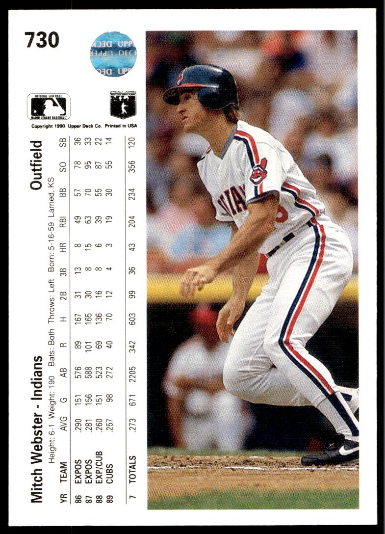 This BaseballΒ card, from 1990 is part of the Upper Deck Β card set. Mitch Webster is featured and has a card number of 730.