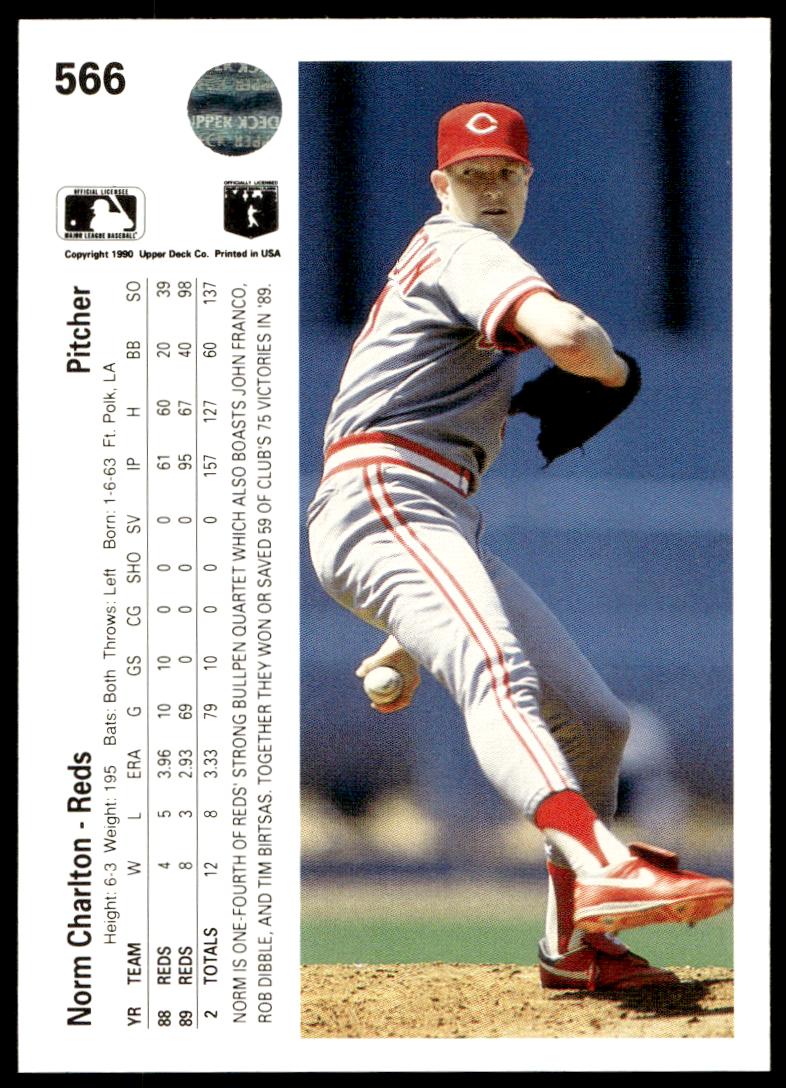 This Baseball card, from 1990 is part of the Upper Deck  card set. Norm Charlton is featured and has a card number of 566.
