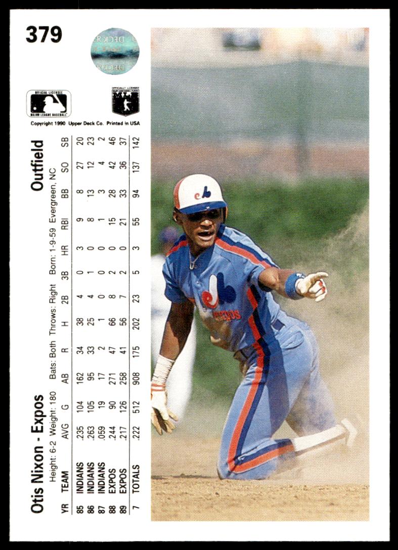 This Baseball card, from 1990 is part of the Upper Deck  card set. Otis Nixon is featured and has a card number of 379.
