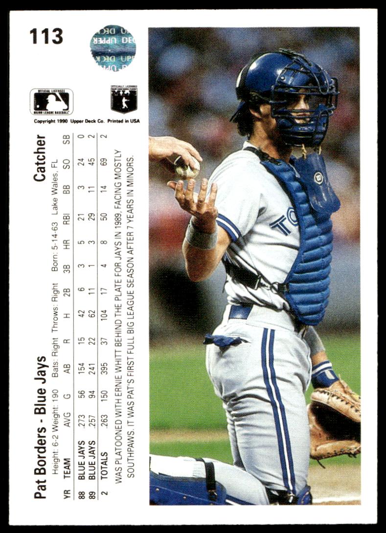 This Baseball card, from 1990 is part of the Upper Deck  card set. Pat Borders is featured and has a card number of 113.