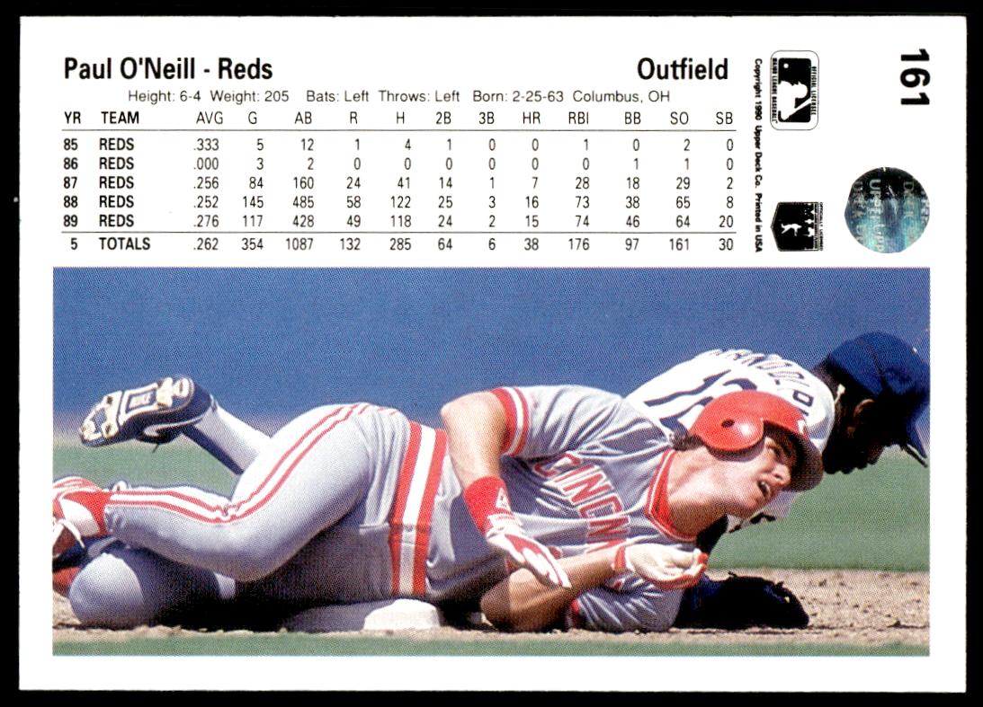 This Baseball card, from 1990 is part of the Upper Deck  card set. Paul O’Neill is featured and has a card number of 161.