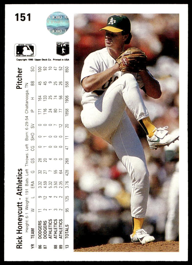This Baseball card, from 1990 is part of the Upper Deck  card set. Rick Honeycutt is featured and has a card number of 151.