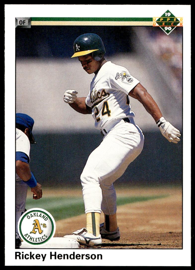 This Baseball card, from 1990 is part of the Upper Deck  card set. Rickey Henderson is featured and has a card number of 334.