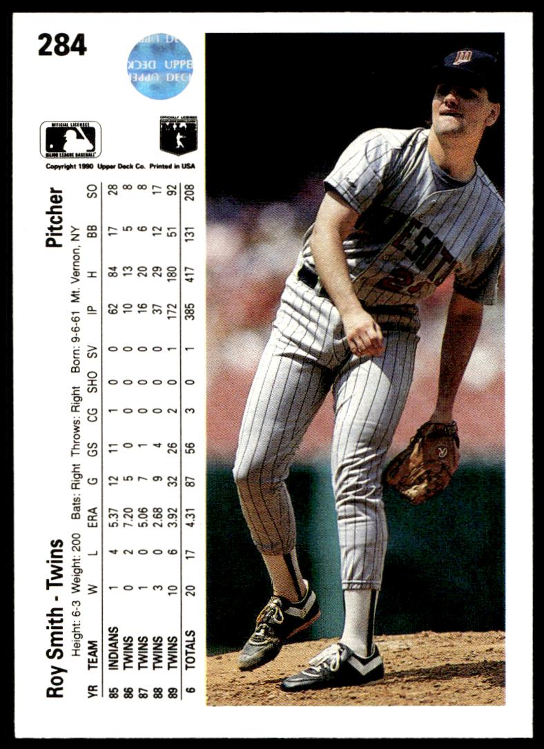 This Baseball card, from 1990 is part of the Upper Deck  card set. Roy Smith is featured and has a card number of 284.