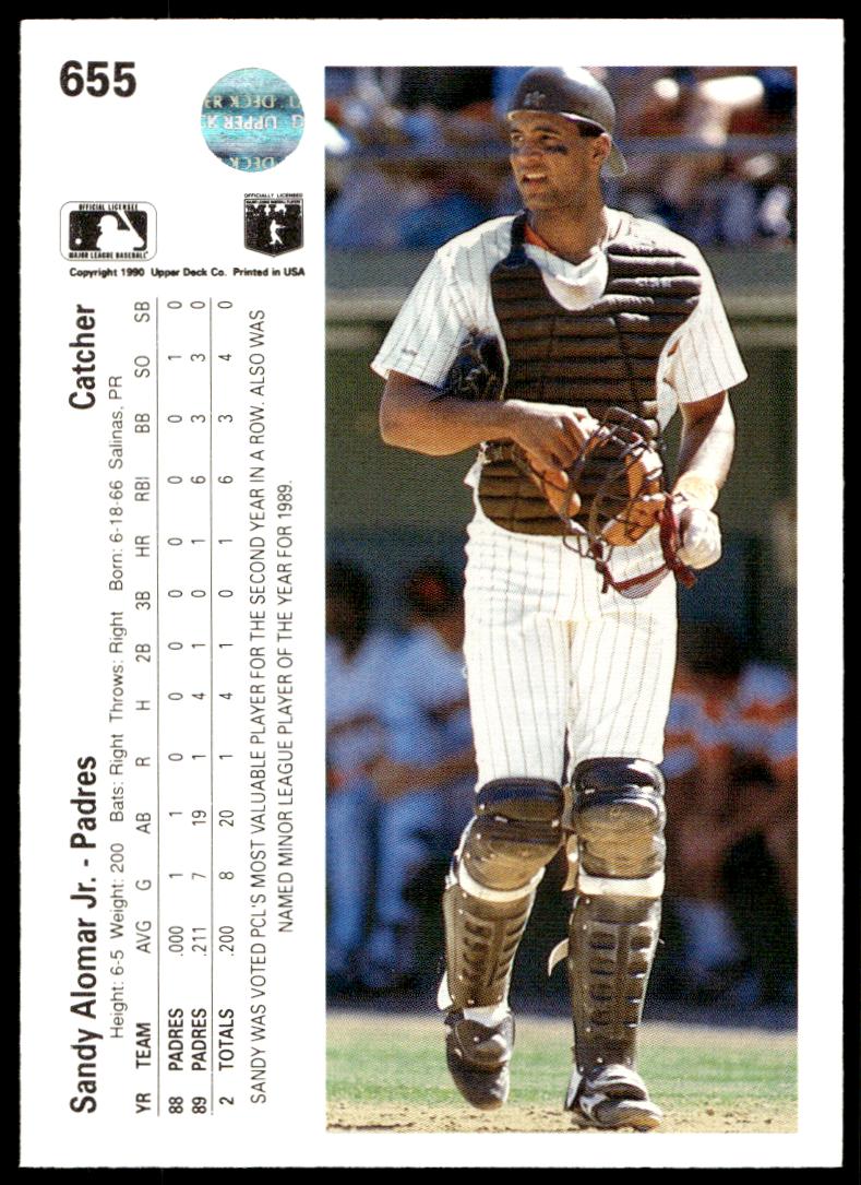 This BaseballΒ card, from 1990 is part of the Upper Deck Β card set. Sandy Alomar, Jr. is featured and has a card number of 655.
