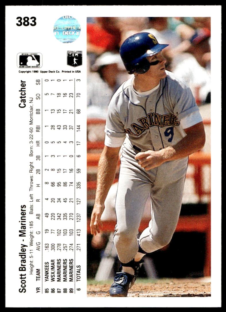 This BaseballΒ card, from 1990 is part of the Upper Deck Β card set. Scott Bradley is featured and has a card number of 383.