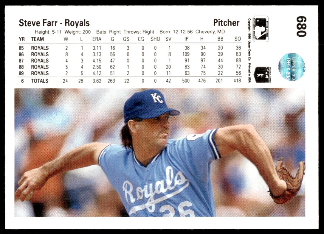 This Baseball card, from 1990 is part of the Upper Deck  card set. Steve Farr is featured and has a card number of 680.