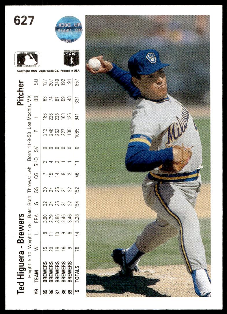 This Baseball card, from 1990 is part of the Upper Deck  card set. Ted Higuera is featured and has a card number of 627.