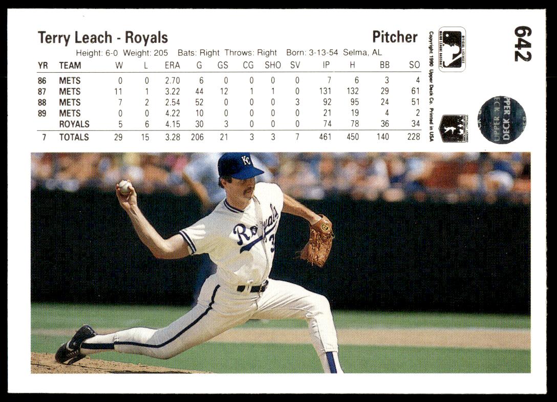 This Baseball card, from 1990 is part of the Upper Deck  card set. Terry Leach is featured and has a card number of 642.