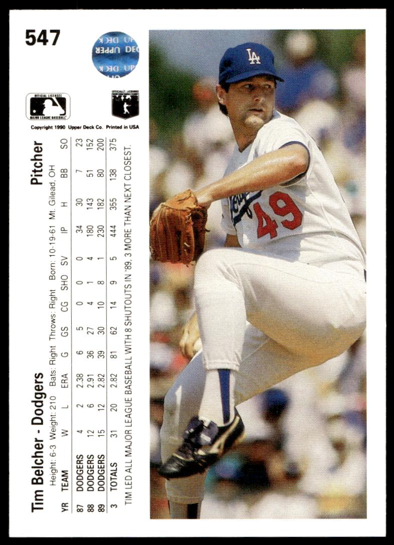 This Baseball card, from 1990 is part of the Upper Deck  card set. Tim Belcher is featured and has a card number of 547.