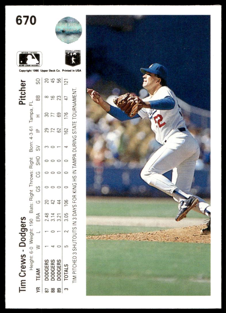 This Baseball card, from 1990 is part of the Upper Deck  card set. Tim Crews is featured and has a card number of 670.