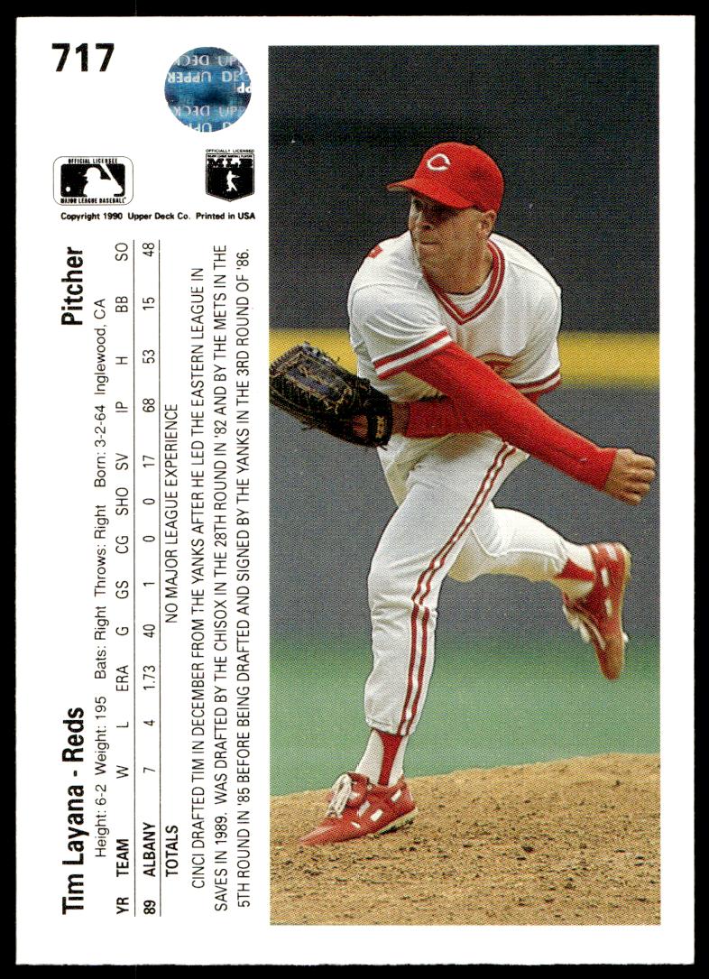 This Baseball card, from 1990 is part of the Upper Deck  card set. Tim Layana is featured and has a card number of 717.