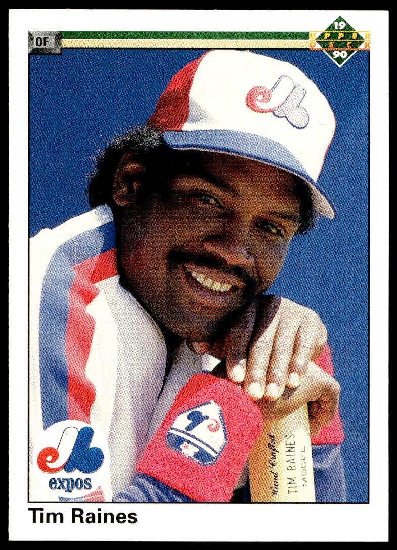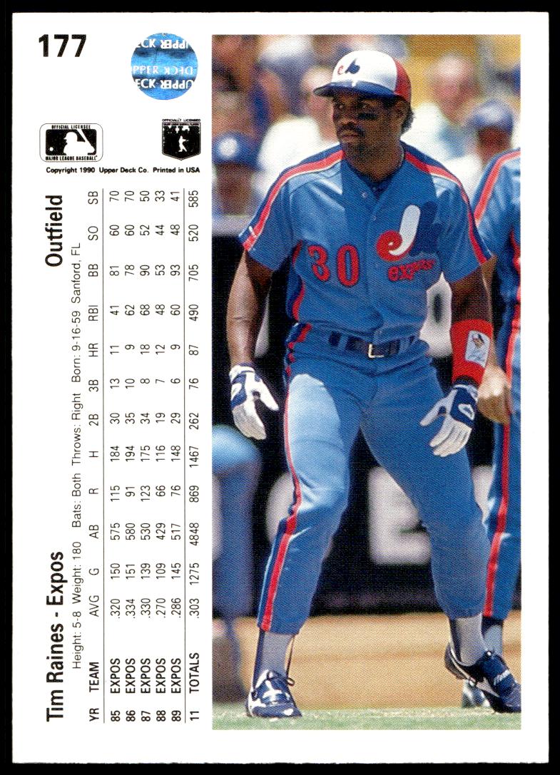 This Baseball card, from 1990 is part of the Upper Deck  card set. Tim Raines is featured and has a card number of 177.