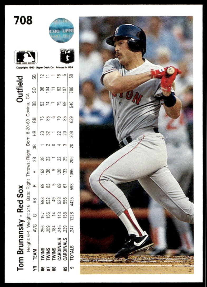This BaseballΒ card, from 1990 is part of the Upper Deck Β card set. Tom Brunansky is featured and has a card number of 708.