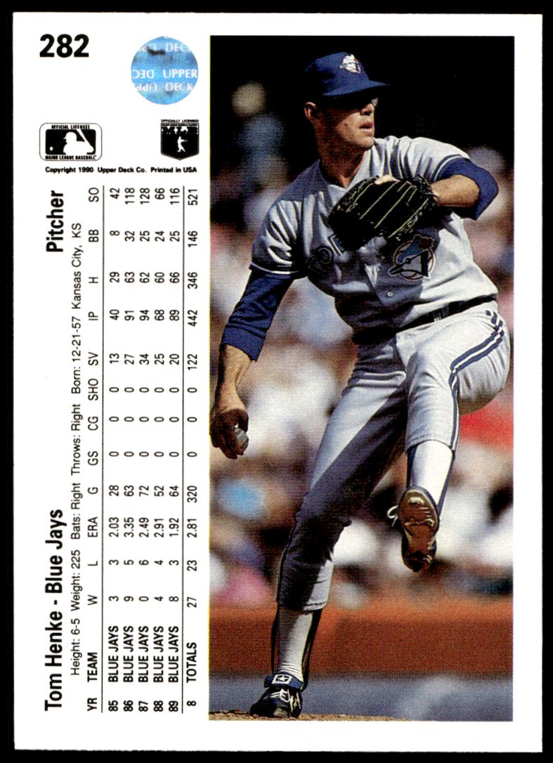 This Baseball card, from 1990 is part of the Upper Deck  card set. Tom Henke is featured and has a card number of 282.
