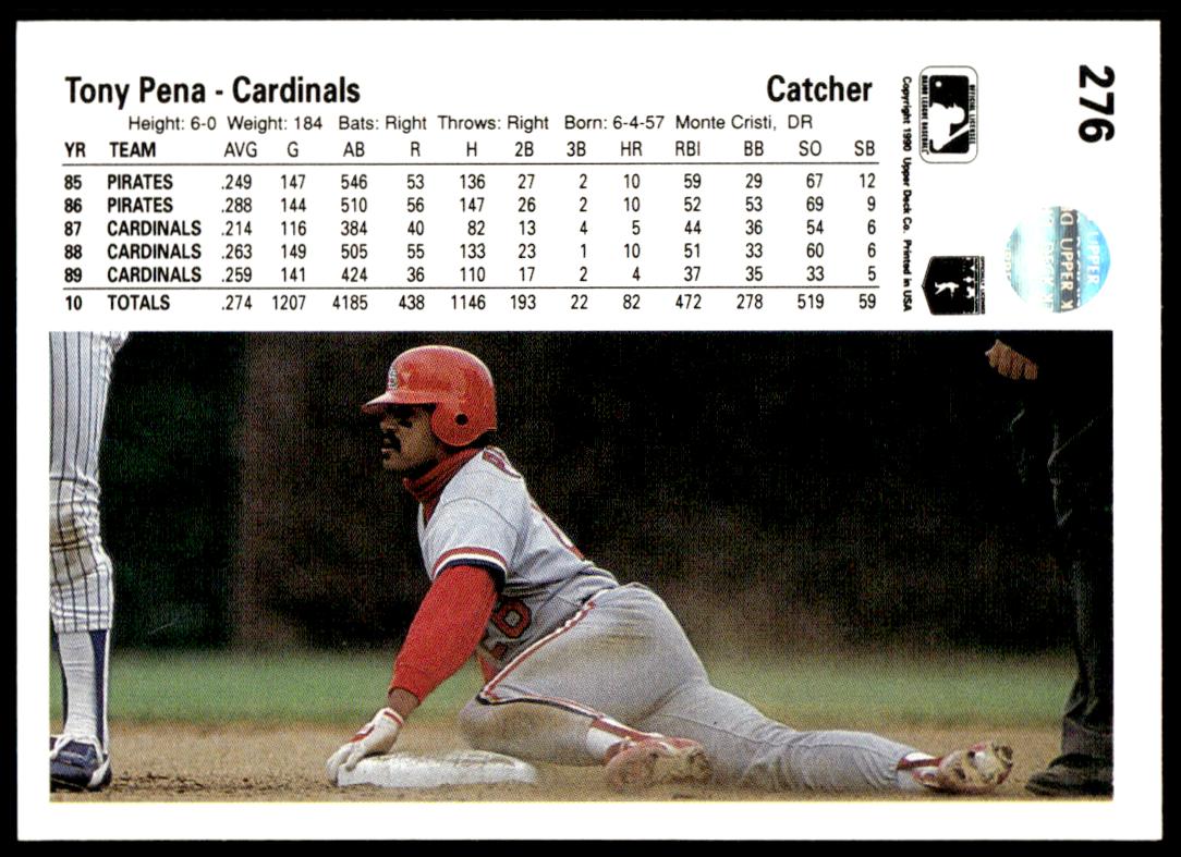 This Baseball card, from 1990 is part of the Upper Deck  card set. Tony Pena is featured and has a card number of 276.