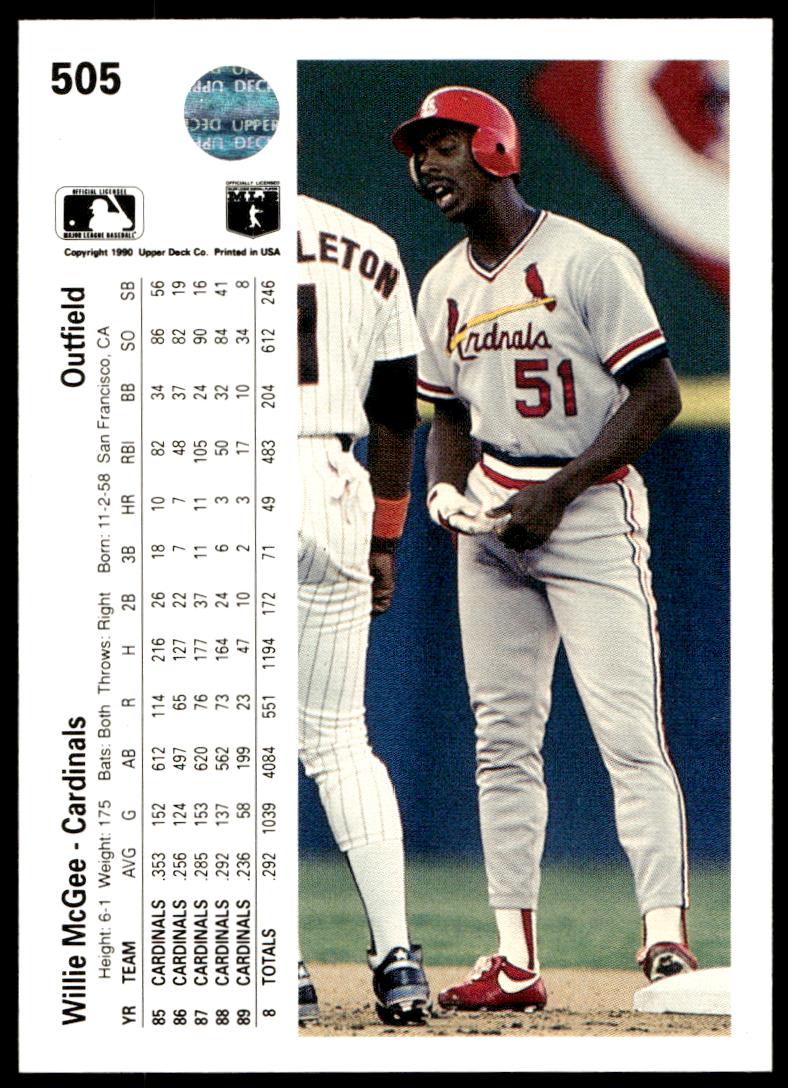This Baseball card, from 1990 is part of the Upper Deck  card set. Willie McGee is featured and has a card number of 505.