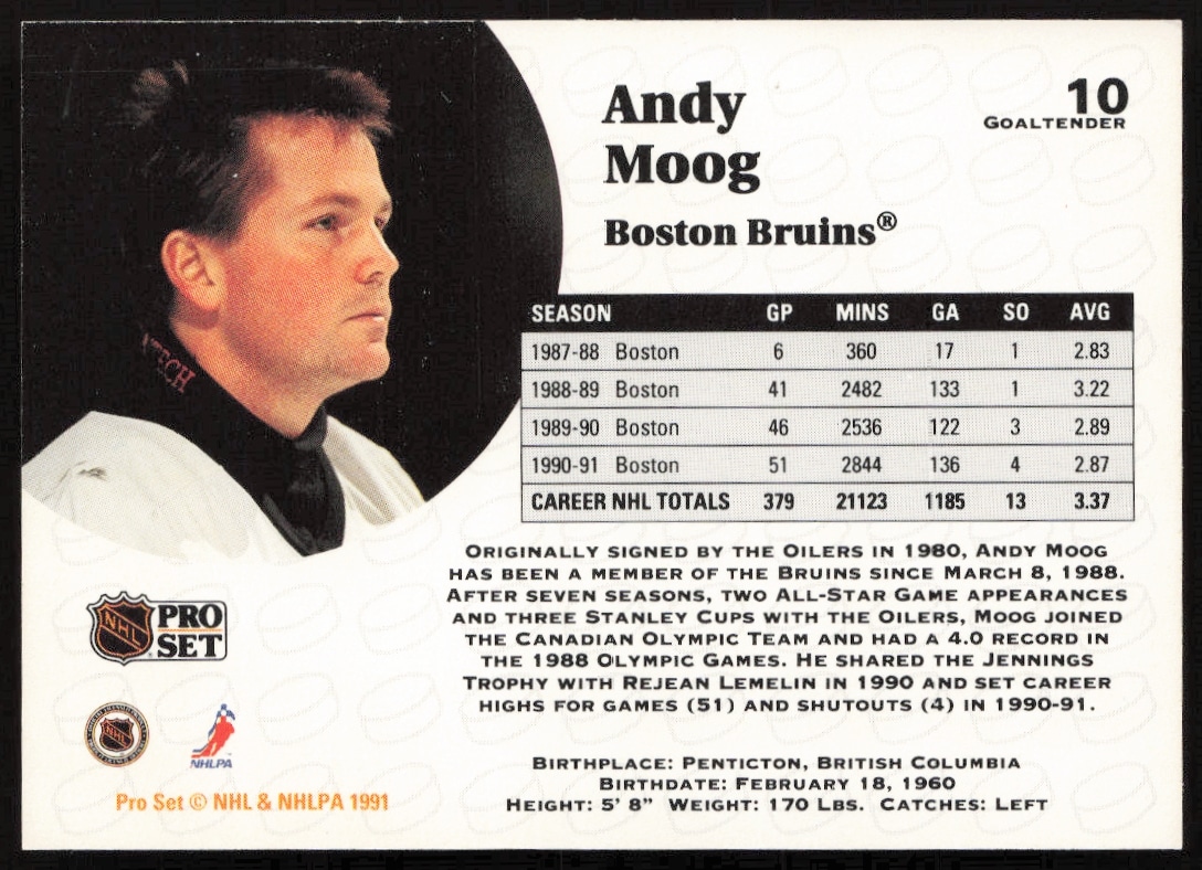 This Hockey card, from 1991-92 is part of the Pro Set NHL card set. Andy Moog is featured and has a card number of 10.