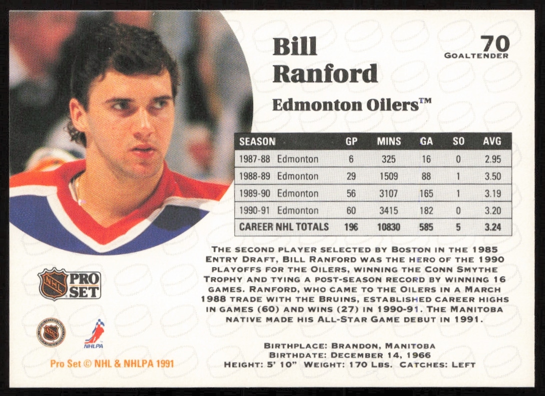 This Hockey card, from 1991-92 is part of the Pro Set NHL card set. Bill Ranford is featured and has a card number of 70.