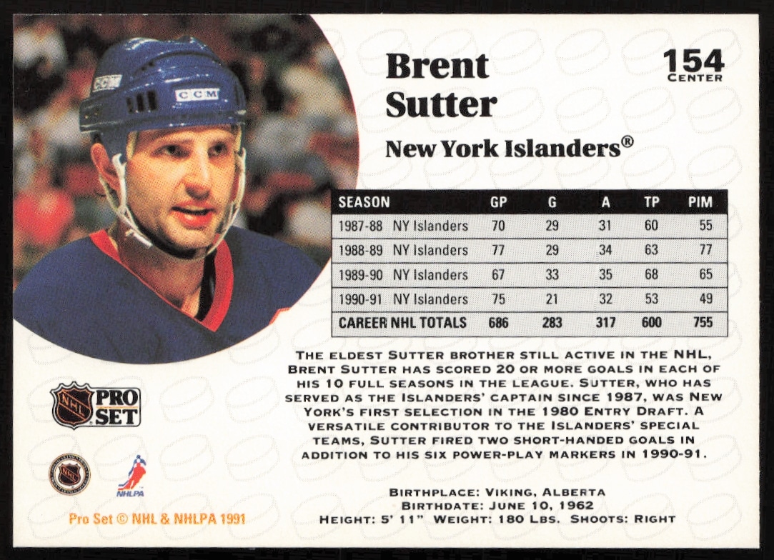 This Hockey card, from 1991-92 is part of the Pro Set NHL card set. Brent Sutter is featured and has a card number of 154.