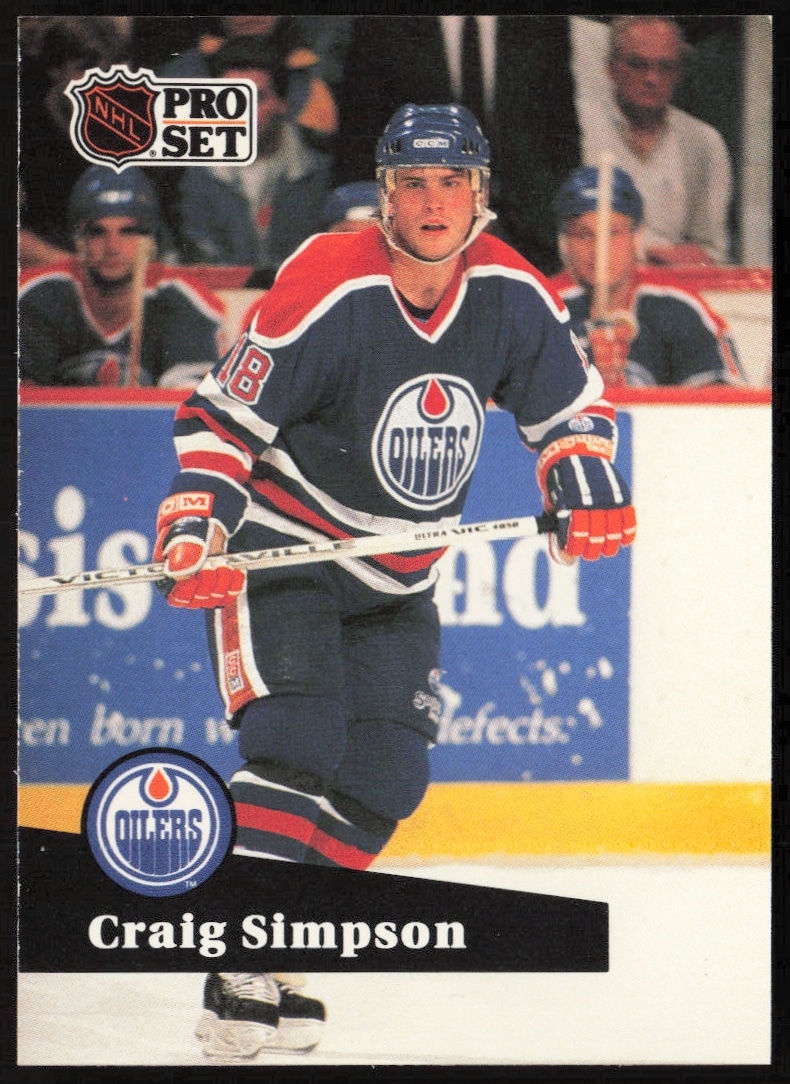 This Hockey card, from 1991-92 is part of the Pro Set NHL card set. Craig Simpson is featured and has a card number of 69.