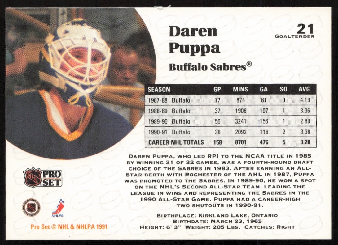 This Hockey card, from 1991-92 is part of the Pro Set NHL card set. Daren Puppa is featured and has a card number of 21.