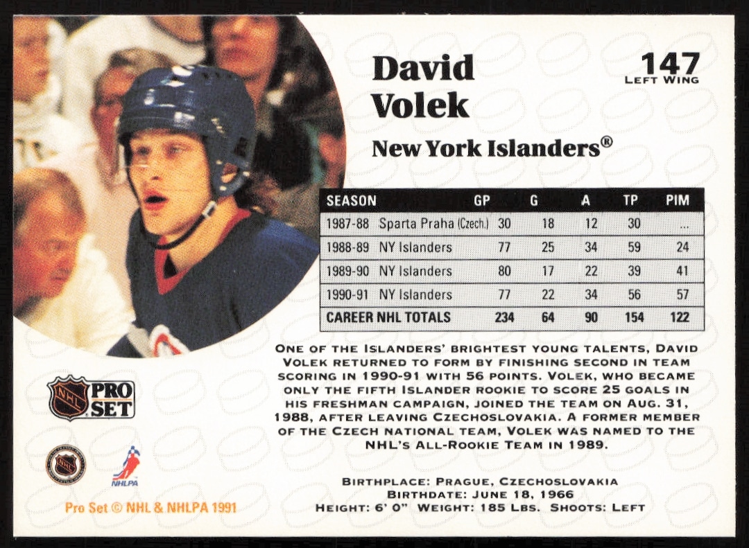 This Hockey card, from 1991-92 is part of the Pro Set NHL card set. David Volek is featured and has a card number of 147.