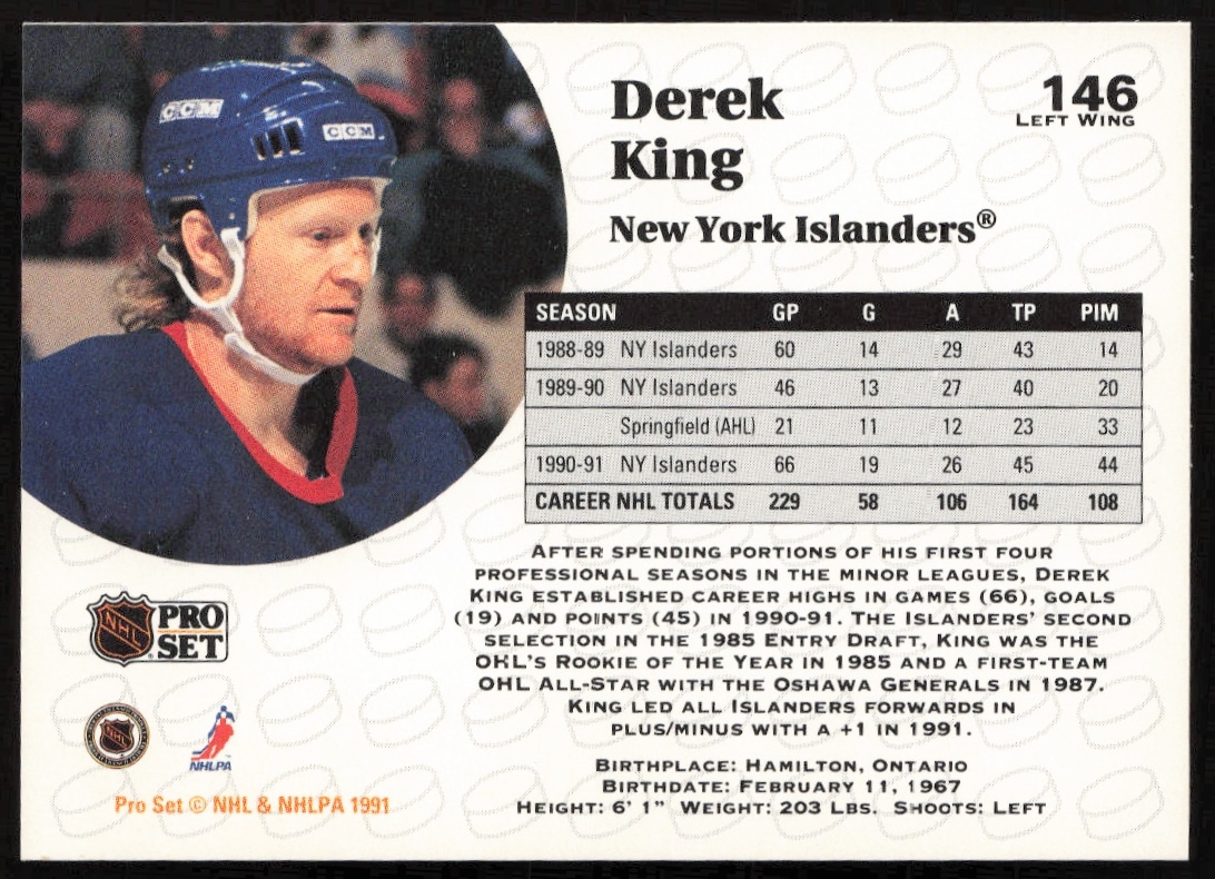 This Hockey card, from 1991-92 is part of the Pro Set NHL card set. Derek King is featured and has a card number of 146.