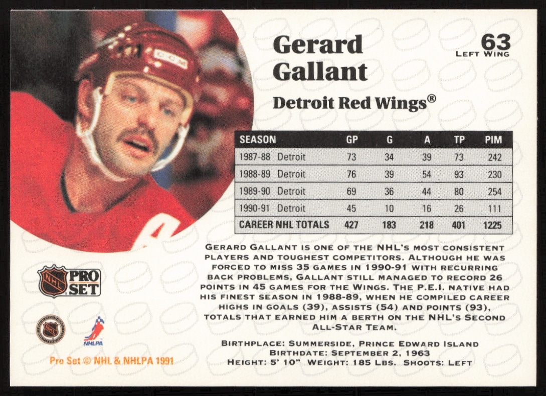 This Hockey card, from 1991-92 is part of the Pro Set NHL card set. Gerard Gallant is featured and has a card number of 63.