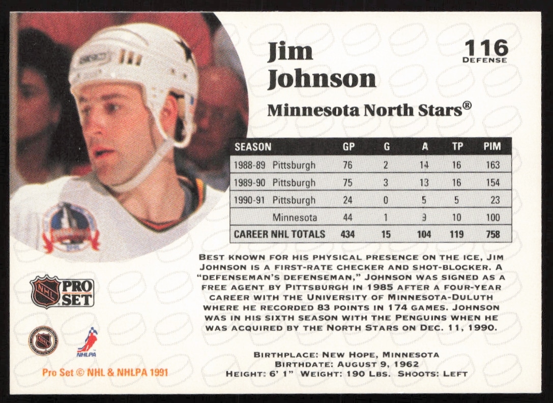 This Hockey card, from 1991-92 is part of the Pro Set NHL card set. Jim Johnson is featured and has a card number of 116.