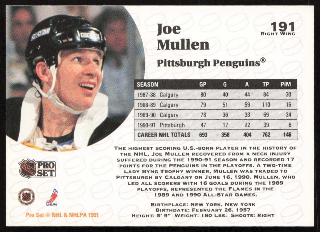 This Hockey card, from 1991-92 is part of the Pro Set NHL card set. Joe Mullen is featured and has a card number of 191.
