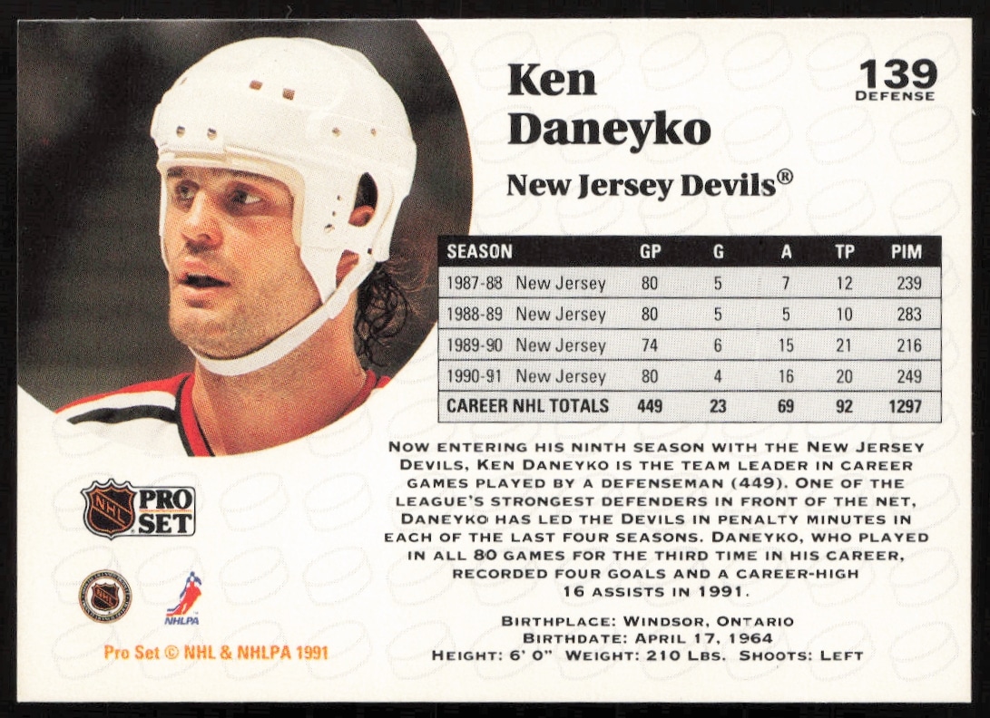 This Hockey card, from 1991-92 is part of the Pro Set NHL card set. Ken Daneyko is featured and has a card number of 139.