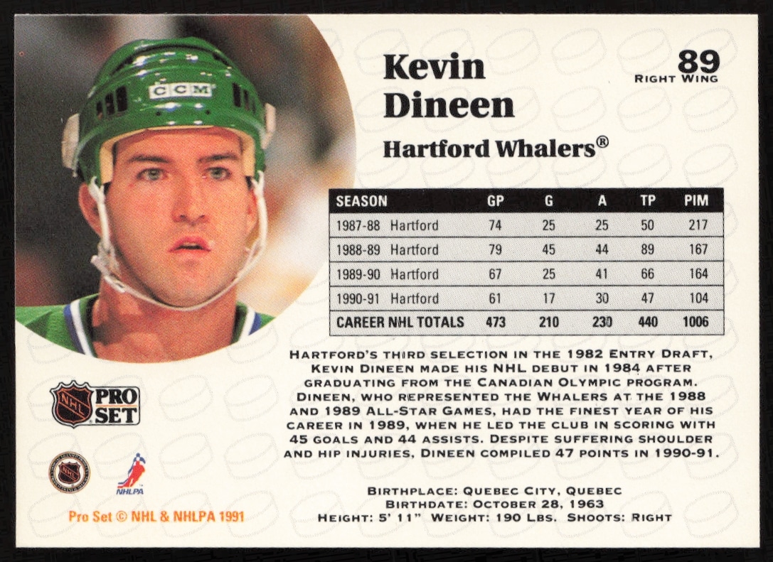 This Hockey card, from 1991-92 is part of the Pro Set NHL card set. Kevin Dineen is featured and has a card number of 89.