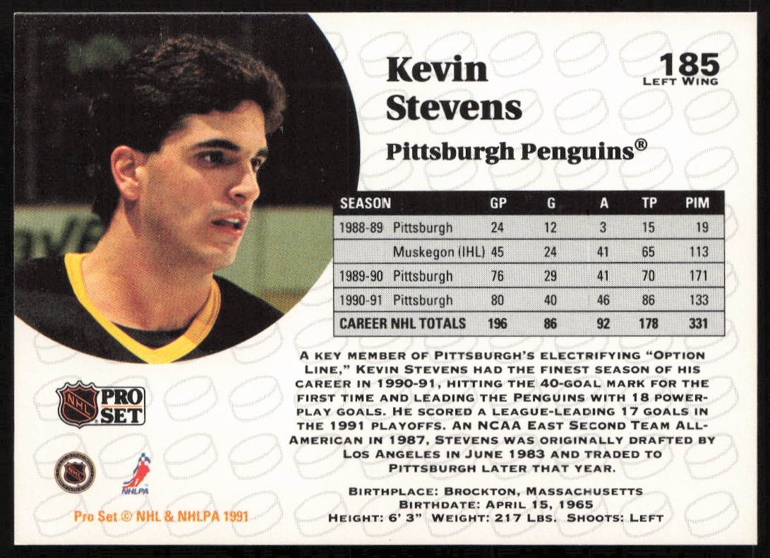 This Hockey card, from 1991-92 is part of the Pro Set NHL card set. Kevin Stevens is featured and has a card number of 185.