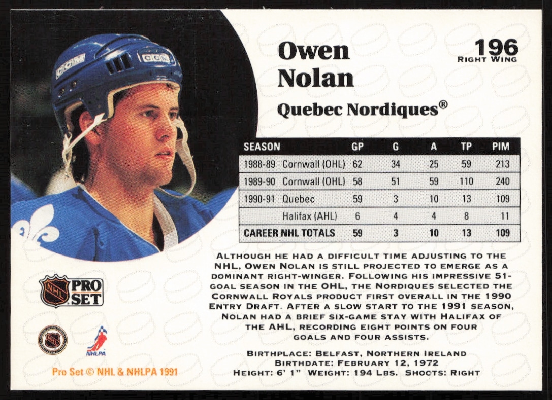 1991-92 Pro Set NHL Owen Nolan #196