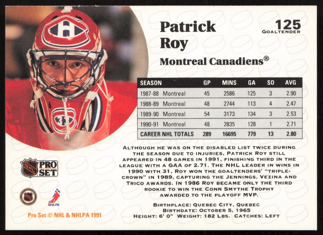 This Hockey card, from 1991-92 is part of the Pro Set NHL card set. Patrick Roy is featured and has a card number of 125.