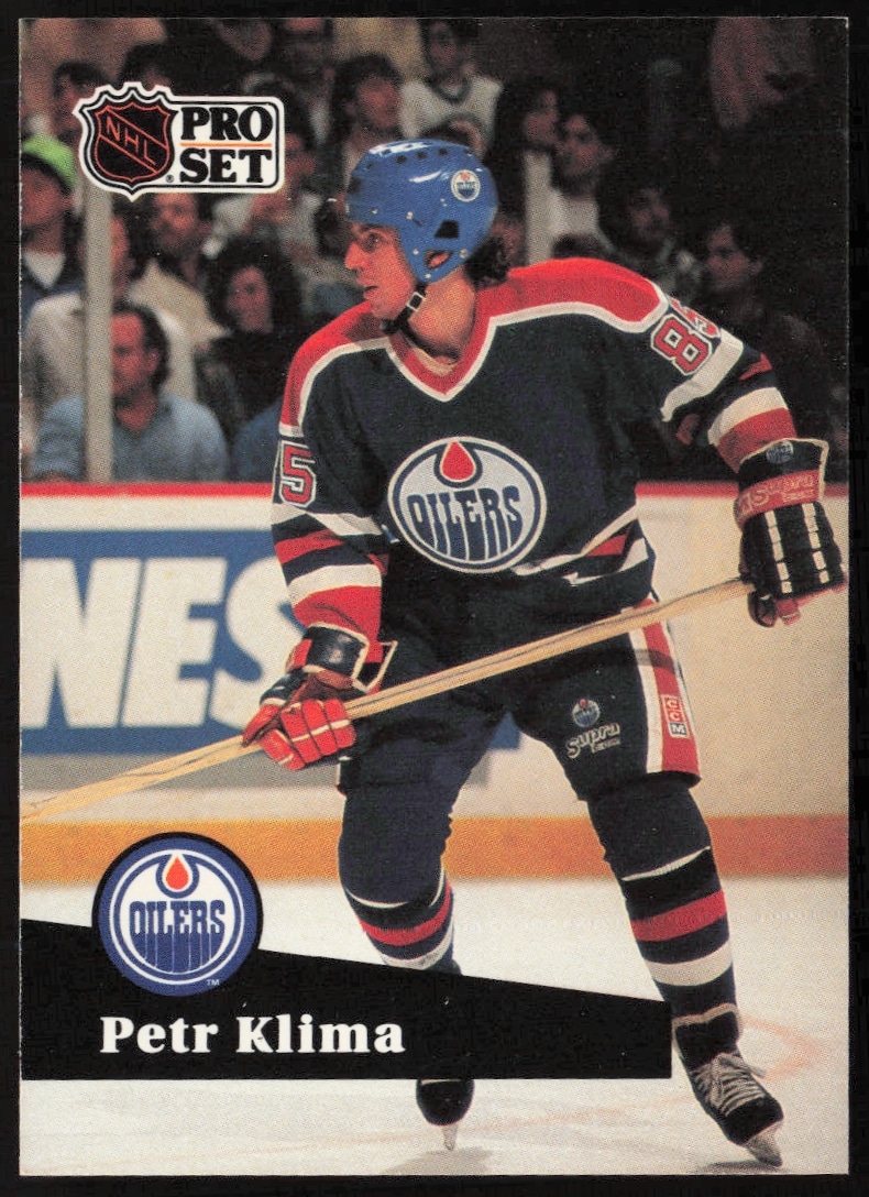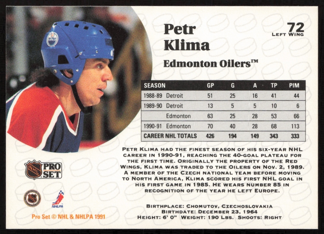 This Hockey card, from 1991-92 is part of the Pro Set NHL card set. Petr Klima is featured and has a card number of 72.