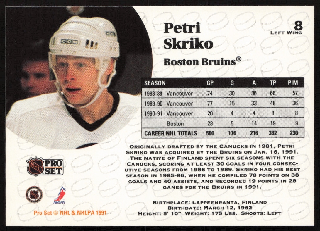 This Hockey card, from 1991-92 is part of the Pro Set NHL card set. Petri Skriko is featured and has a card number of 8.