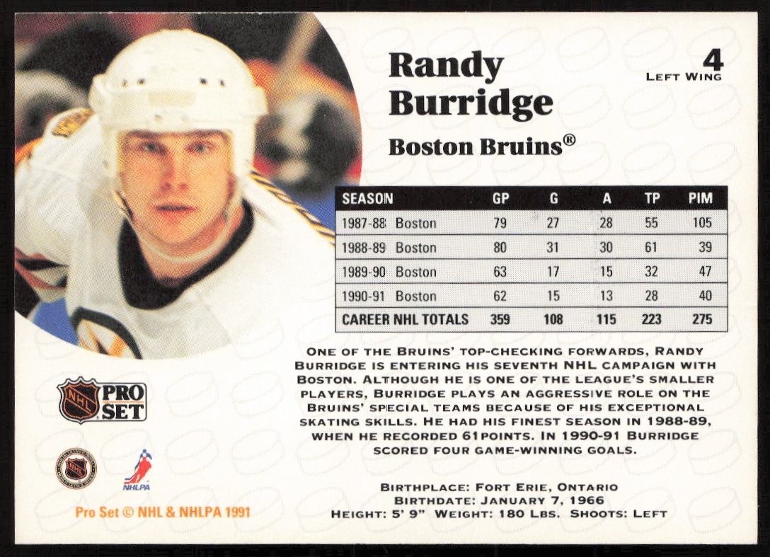 This Hockey card, from 1991-92 is part of the Pro Set NHL card set. Randy Burridge is featured and has a card number of 4.