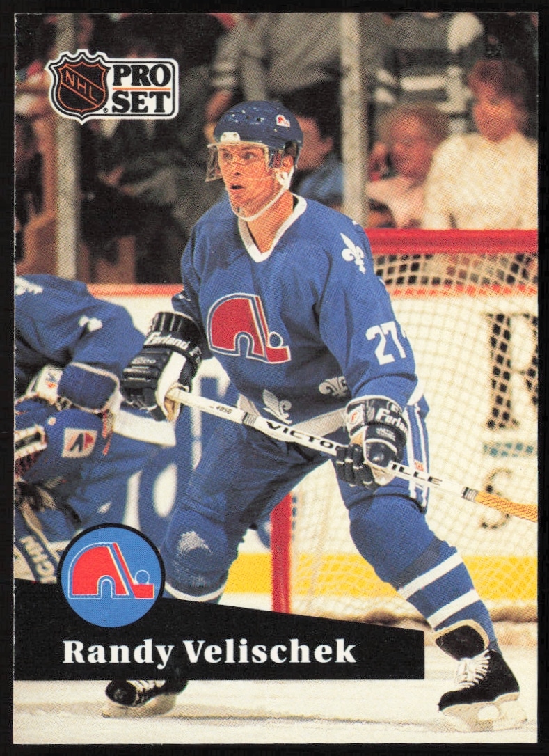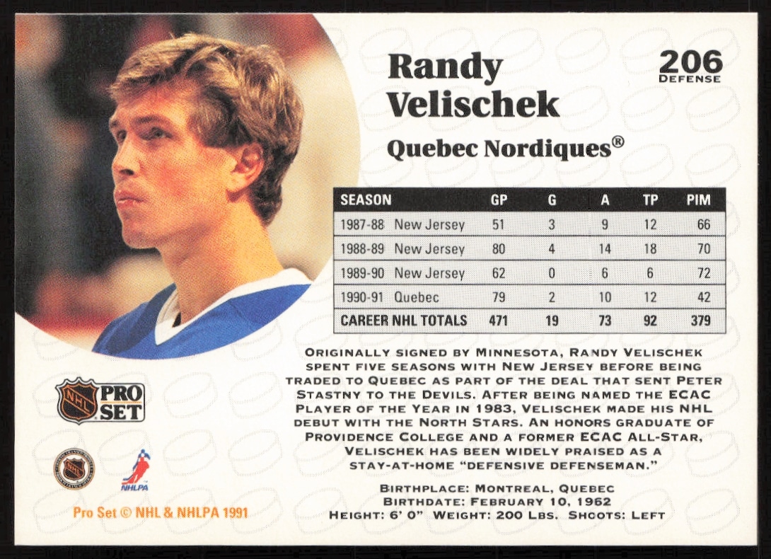 This Hockey card, from 1991-92 is part of the Pro Set NHL card set. Randy Velischek is featured and has a card number of 206.
