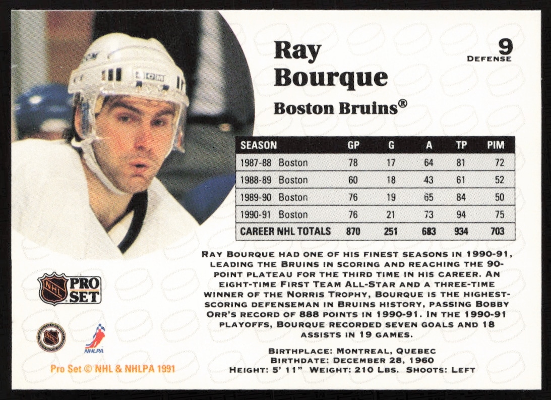 This Hockey card, from 1991-92 is part of the Pro Set NHL card set. Ray Bourque is featured and has a card number of 9.