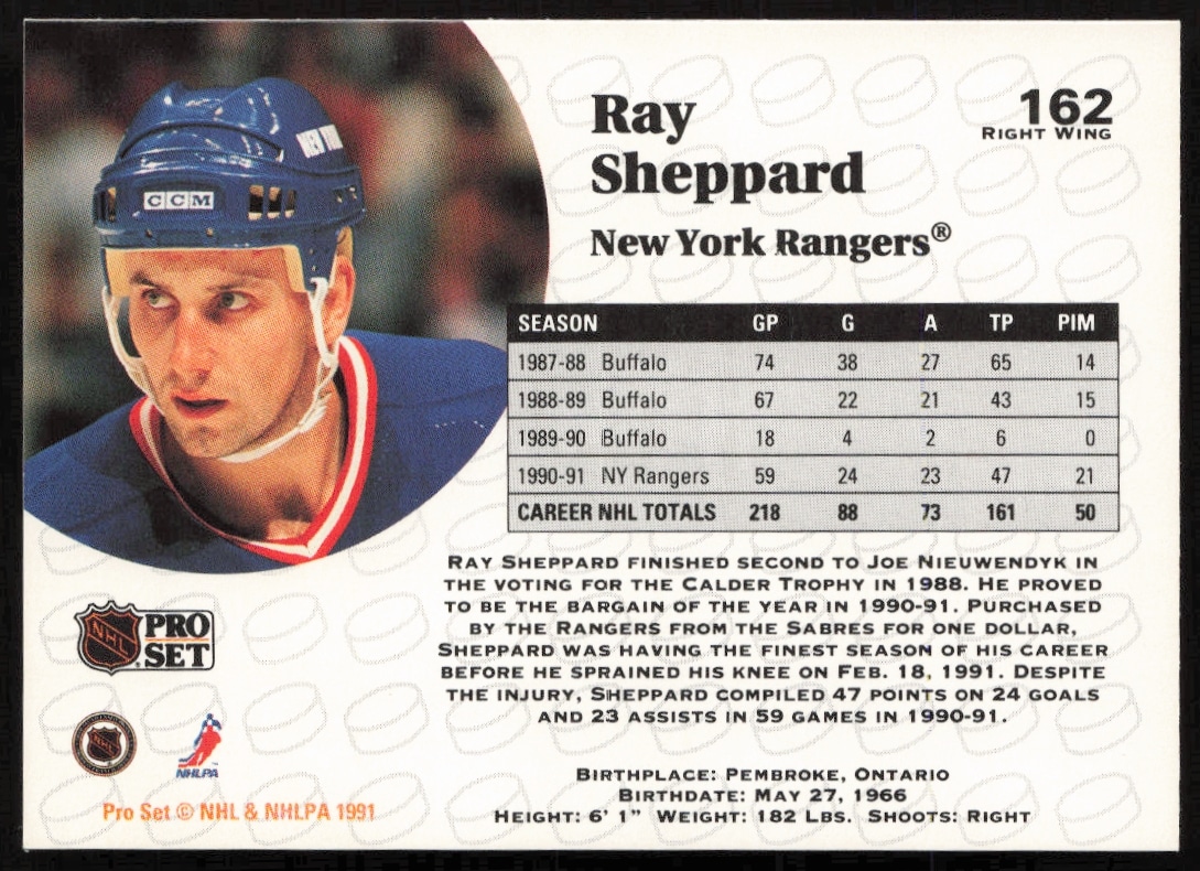This Hockey card, from 1991-92 is part of the Pro Set NHL card set. Ray Sheppard is featured and has a card number of 162.