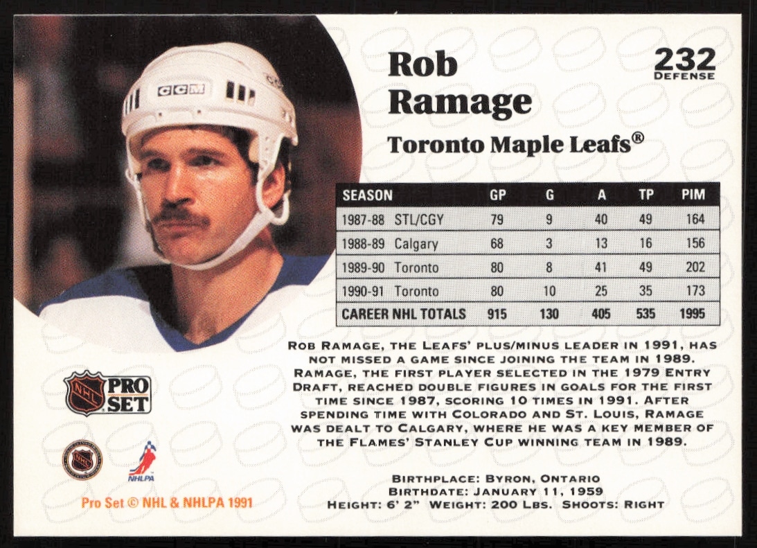 This Hockey card, from 1991-92 is part of the Pro Set NHL card set. Rob Ramage is featured and has a card number of 232.