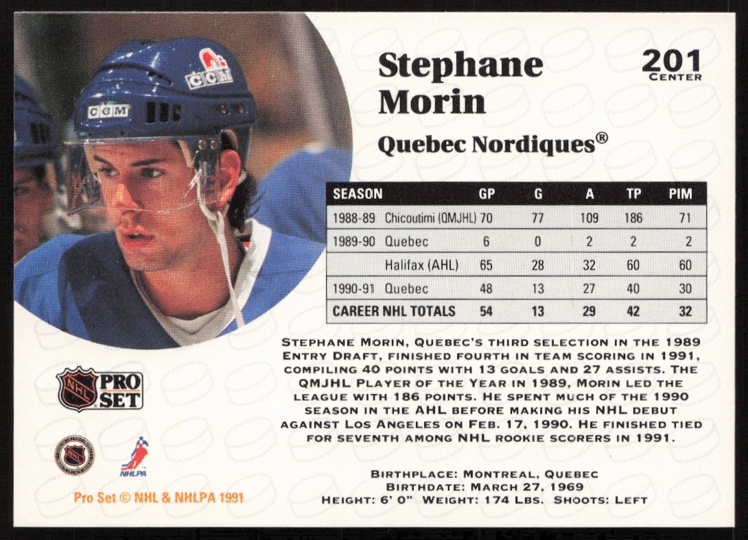 This Hockey card, from 1991-92 is part of the Pro Set NHL card set. Stephane Morin is featured and has a card number of 201.
