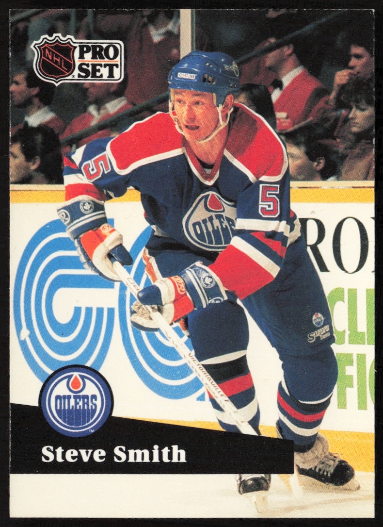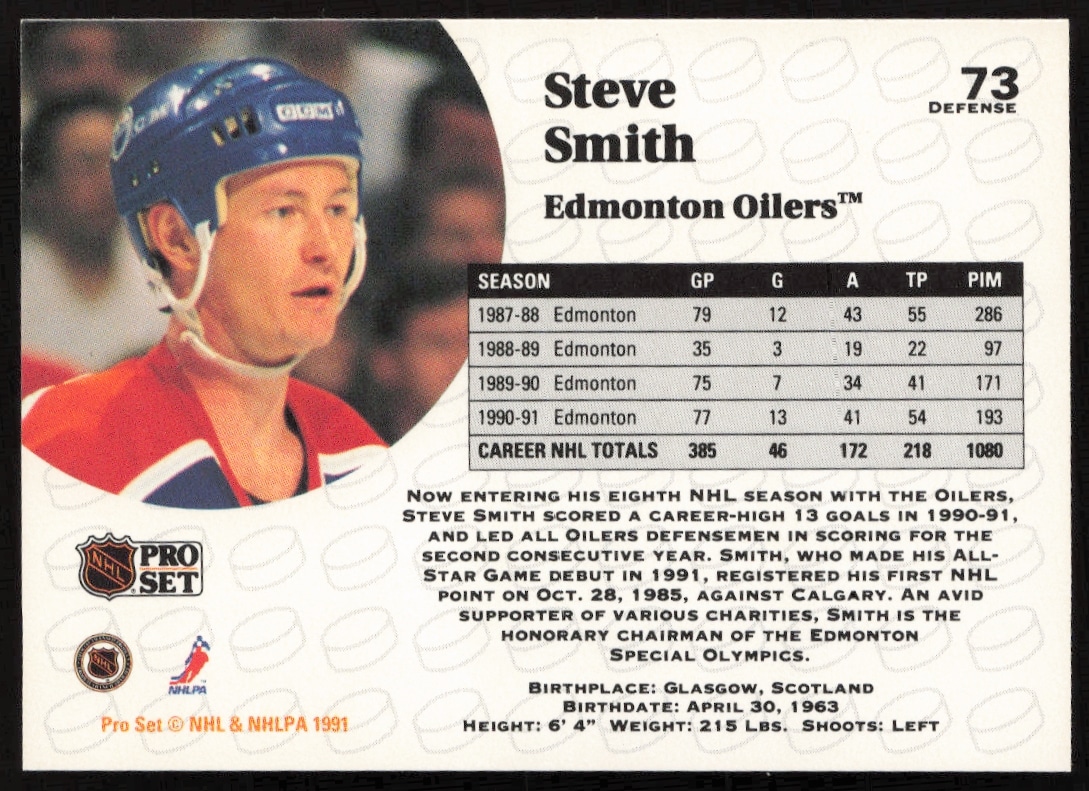 This Hockey card, from 1991-92 is part of the Pro Set NHL card set. Steve Smith is featured and has a card number of 73.