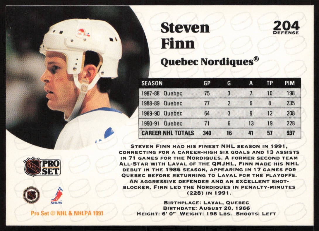This Hockey card, from 1991-92 is part of the Pro Set NHL card set. Steven Finn is featured and has a card number of 204.
