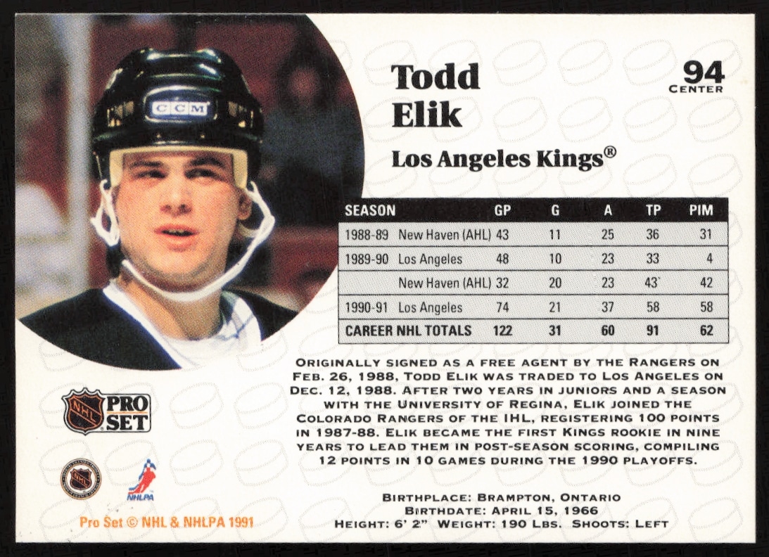 This Hockey card, from 1991-92 is part of the Pro Set NHL card set. Todd Elik is featured and has a card number of 94.